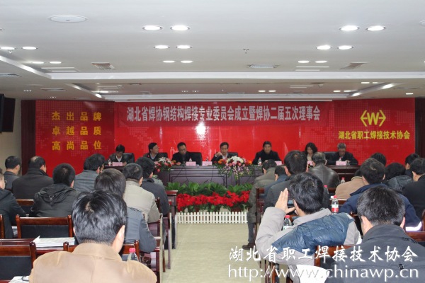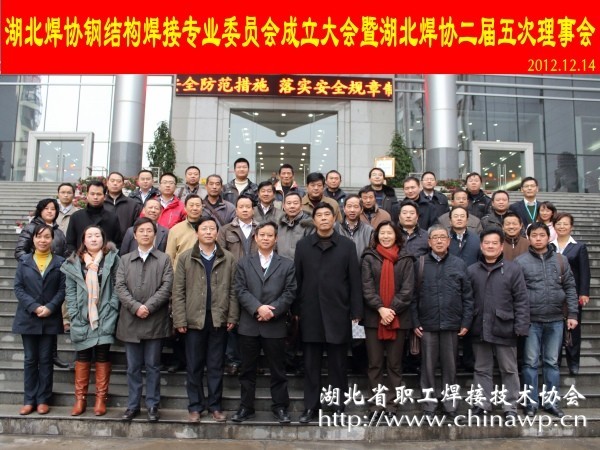 “湖北省职工焊协钢结构焊接专业委员会”成立会暨焊协二届五次理事会于20121214日在武汉新时代商务中心中建三局隆重召开。首届钢结构焊接专委会委员;湖北省职工焊协理事、顾问和领导、嘉宾及新闻媒体单位记者等70余人参加了会议。湖北省总工会领导吴孝义巡视员、湖北省民政厅社团管理局涂才江副局长,中建三局李勇副局长以及专程从北京赶来的中国工程建设焊接协会刘景凤秘书长莅临大会并发表了热情洋溢的讲话。会议内容紧凑、务实高效,既完成了钢结构焊接专业委员会的成立事宜,又深入总结了湖北焊协2012年度工作开展情况,同时部署了2013年的活动计划,博得了与会代表们的高度赞扬和一致好评。