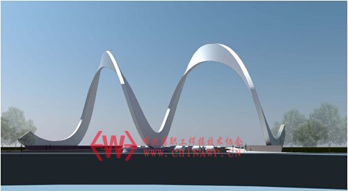 长沙梅溪湖雕塑是一个双门型的雕塑,在建筑外形以中国丝带为设计元素,力求打造城市门户的氛围。雕塑采用异形曲梁结构,不仅增加了立体感及空间感,并且结合桥下的景观廊道,加大了桥梁的景观性与层次性。雕塑共有23个分段组成,其中最小分段约14.2吨,最大分段约17.8吨,整个雕塑约350吨。其制作难度之大超乎想象,主要是:翼腹板、纵向加筋、弯扭成型难度大;装配精度难控制;焊缝要求高,焊接变形难控制;构件检测难度大,精度要求高等。经过反复测量验证,各观测点坐标均能达到高精度水平,满足技术要求,率先攻克了国内最大弯扭曲梁制造技术的难关。