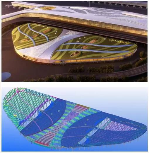 ![]() 钢构分公司精英团队针对交通中心工程屋面幕墙项目特点,特别制定了以深化设计为龙头的施工指导思想。此屋面幕墙曲面不规则,材料种类多,杆件、单元板块规格多、定位量大,相互交接,多层多道工序衔接紧密,针对以上众多难点,非BIM技术可以攻克。通过专用软件建立三维模型,智能生成指导加工安装的深化设计图。并且在模型中进行施工模拟,形成精细化、可视化管理模式,在工厂多杆件焊接组合形成弧形平面构件,然后运输至工地进行立体组装,巧妙地避免了上万个测量点的定位困扰,并将大量的拼装、焊接工作消化于工厂,在工地实现了 “蝶身”龙骨造型。