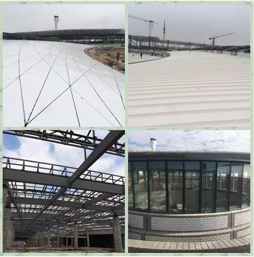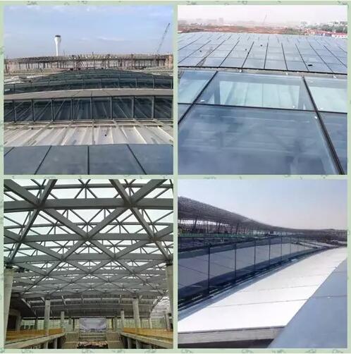 该工程的屋面幕墙则是该工程中的点睛之笔,作为从室内空间到室外空间的过渡层,造型独特,兼顾功能和艺术审美于一体,关乎工程的成败,因此倍受重视。此屋面幕墙工程总面积约2.5万平米,主要由玻璃采光顶、金属屋面以及造型钢龙骨组成。屋面中部双曲玻璃采光顶和双曲金属屋面组合,造型流畅,是交通中心的视觉焦点,采光屋顶由23行玻璃天窗组成,在两侧铝合金单板金属双曲装饰面的衬托下,凸显出层层逐级抬高的波浪形动态效果。整个机场造型立意于“蝶飞凤舞”的巧妙构思,交通中心宛如“彩蝶振翅”,与周围建筑相得益彰,完美融合。