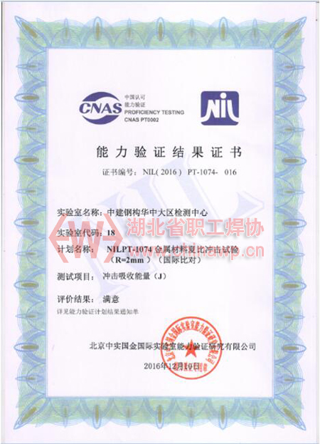 日前,从北京中实国金国际实验室能力验证研究院获悉,在2016年举办的全国实验室检测能力验证活动中,中建钢构华中大区检测中心参加的“金属材料夏比冲击试验”(国际比对)能力验证,获得满意证书,验证成绩优秀。标志着中建钢构华中大区“金属材料夏比冲击试验”方法科学,测量准确水平达到国内先进。
