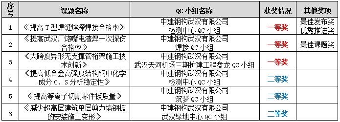![]() 据悉,本届QC成果交流发布活动课题数量321个是历年来参加人数之最,经过专家严格的初审及发布现场上的个人表现成绩综合评判,中建钢构华中大区再次刷新QC活动参赛经历,六个参赛成果均获得一、二等奖等多项奖项,展现出在质量管理小组QC活动中的专业技术水平和工作能力,反映了中建钢构在质量管理工作中的优秀水准,也是华中大区质量系统贯彻年初工作会精神“坚持质量引领创新驱动,不断提升竞争实力”:质量工作实施的具体体现。