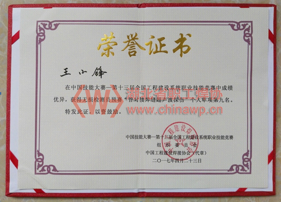 经过全面的理论考试与精准的实操测试,中建钢构华中大区检测中心无损检测员王小锋沉着冷静、缜密思维、精准独断,经过激烈角逐、奋勇比拼,取得了“管对接焊缝超声波探伤”竞赛个人单项第九名的好成绩,中建钢构华中大区检测中心无损检测的技术能力得到肯定和认可,为中建钢构打造质量引领创新驱动、提升竞争实力,建设品质钢构、百年老店的目标打下了良好的支撑保障作用。