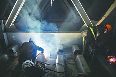 焊接工在桥体内工作    长江日报记者任勇 摄
