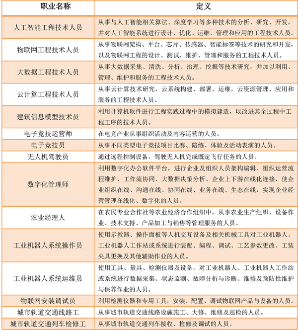 近日,我国人社部发布公示通告拟发布15个新职业,其中涉及机器人的有工业机器人系统操作员、工业机器人系统运维员,其余13个则是人工智能工程技术人员、物联网工程技术人员、大数据工程技术人员、云计算工程技术人员、建筑信息模型技术员、电子竞技运营师、电子竞技员、无人机驾驶员、数字化管理师、农业经理人、物联网安装调试员、城市轨道交通线路工以及城市轨道交通列车检修工。前6个基本是职称,后9个基本是职业资格。