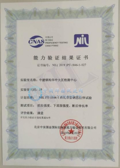 日前,从北京中实国金国际实验室能力验证研究院获悉,在2019年举办的全国实验室检测能力验证活动中,中建钢构华中大区检测中心参加的“热轧带肋钢筋拉伸试验”能力验证获得“满意”证书,验证成绩优秀,标志着中建钢构华中大区“热轧带肋钢筋拉伸试验”检测方法科学、测量准确水平达到国内先进。