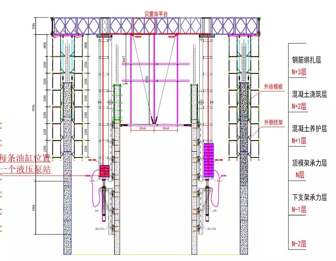 二是进一步优化顶模贝雷架平台的空间布局,理清顶模平台各专业空间穿插关系,充分利用桁架上下两层空间,把水电设备、液压设备、监测设备、控制室、施工机具、机房、移动厕所等设备设施进行紧凑合理布设,扩充贝雷架上平台使用面积,提高顶模作业层施工效率。