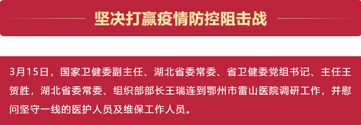 ![]() ![]() 在鄂州雷山医院,王贺胜主要了解了鄂州雷山医院建设情况以及目前救治新冠病人等情况,他对奋战在一线的医护人员和维保人员表达了亲切的慰问和衷心的感谢。