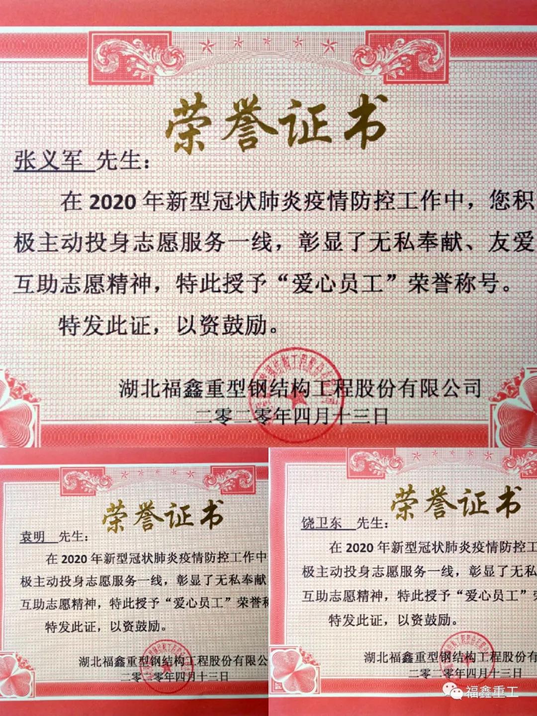 在这个特殊时期,全国上下众多企业,要么寻求国家贷款支持,要么降薪裁员选择丢车保帅,但就是这么一个万分困难的时期,湖北福鑫重型钢结构工程股份有限公司却选择逆行向前,董事长王永钟先生以一位优秀企业家的胸襟,在克服自身企业困境的同时,不仅带头为战斗在前线的白衣天使进行捐助,坚持企业不裁员,还增设岗位,进一步解决社会就业压力,同时,在员工的健康防护方面大量投入,确保每一位福鑫人的健康安全,与此同时,同样具有大爱精神的福鑫员工,更是涌现出一大批的志愿者,积极投身于各自家庭所在地的抗疫一线和志愿者行动中,不计报酬,奋斗在当地政府战“疫”第一线。