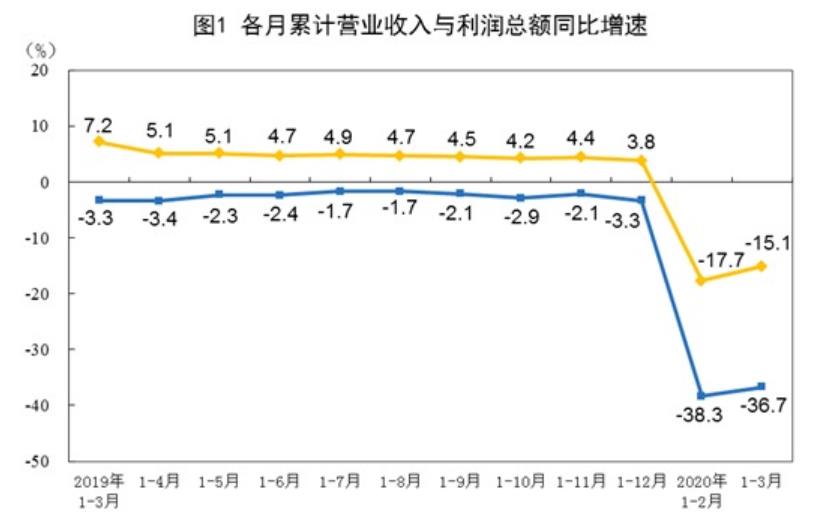 智通财经APP获悉,国家统计局今日公布,2020年1—3月份,全国规模以上工业企业实现利润总额7814.5亿元,同比下降36.7%;1—3月份,规模以上工业企业中,国有控股企业实现利润总额2226.7亿元,同比下降45.5%;1—3月份,规模以上工业企业实现营业收入19.86万亿元,同比下降15.1%;1—3月份,在41个工业大类行业中,2个行业利润总额同比增加,39个行业减少
