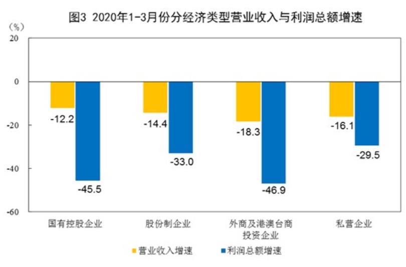 四是私营、小型、外资企业利润降幅不同程度收窄。3月份,私营企业利润同比下降20.1%,降幅比1—2月份收窄16.5个百分点;小型企业利润下降17.0%,降幅收窄23.7个百分点;外商及港澳台商投资企业利润下降38.9%,降幅收窄14.7个百分点。