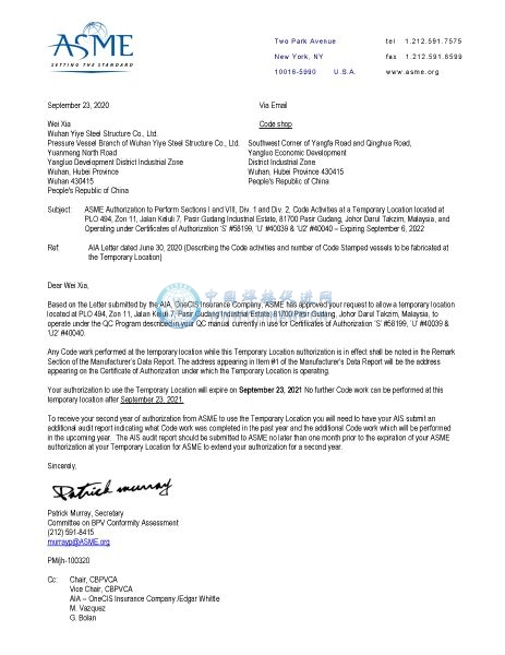 9月24日,中国一冶钢构公司收到了美国机械工程师协会(ASME)临时认证工厂的批准函,函件表明,中国一冶钢构公司马来西亚临时认证工厂正式获得美国机械工程师协会(ASME)许可,根据ASME 的规定,该临时工厂处于中国一冶钢构公司锅炉压力容器质控体系控制下,可作为公司的认证生产车间,从事认可的S, U, U2类锅炉和压力容器建造,有效期2年。