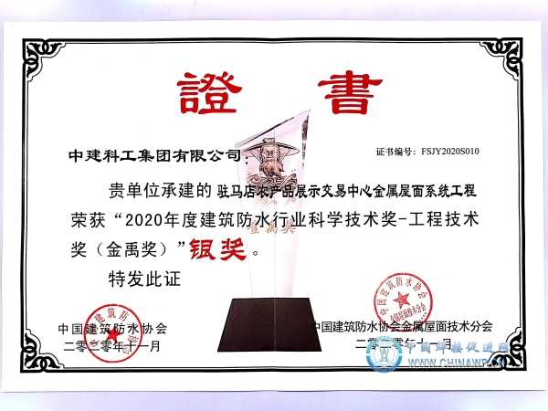 日前,从2020年中国建筑防水行业年会上获悉,由中建科工集团有限公司负责施工的驻马店农产品展示交易中心金属屋面系统工程获得2020年度中国建筑防水行业科学技术奖——工程技术奖(金禹奖)“银奖”。