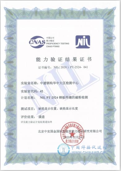 日前,从北京中实国金国际实验室能力验证研究有限公司获悉,在2020年12月举办的全国实验室检测能力验证活动中,中建钢构华中大区检测中心参加的“钢板焊缝的磁粉检测”能力验证获得“满意”评价证书,验证成绩优秀。标志着中建科工华中钢结构公司“钢板焊缝的磁粉检测”方法科学,测量准确水平达到国内先进。