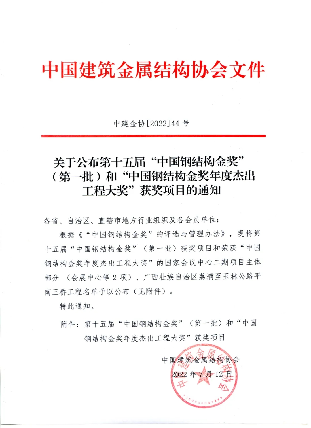 (通讯员:杨杰)7月25日,第十五届“中国钢结构金奖”(第一批)获奖项目结果揭晓,经中国建筑金属结构协会严格核查和评委会审定,中建科工华中大区4个项目获“中国钢结构金奖”,分别是合肥滨湖国际会展中心、武汉蔡甸城市综合服务中心、阿克苏广播电视塔、荆州广播电视发射塔。这4张“金”牌名片,代表着建筑钢结构行业工程质量的最高荣誉,彰显着中建科工国内领先的建造水平。