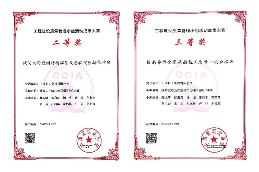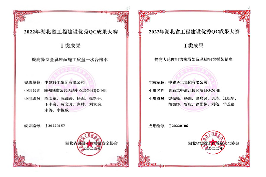 (通讯员:金磊)近日,中国建筑业协会公布2022年全国工程建设质量管理小组活动成果大赛结果,中建科工湖北公司两项成果斩获大奖,分别是黄石二中滨江校区项目QC小组课题《提高大跨度钢结构塔架及悬挑钢梁拼装精度》获得二等奖,随州城市公共活动中心综合体项目QC小组课题《提高异型金属屋面施工质量一次合格率》获得三等奖。