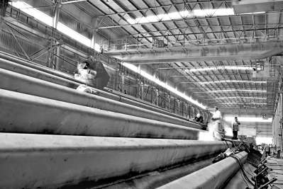 位于阳逻开发区的武汉一冶钢构公司以科技创新实现跨越式发展,成立仅5年就已迈过10亿元大关,成为华中地区规模最大、技术最先进、门类最齐全的钢结构公司。图为昨日工人们正在加紧加工武汉市内钢结构立交桥所需的钢箱梁。