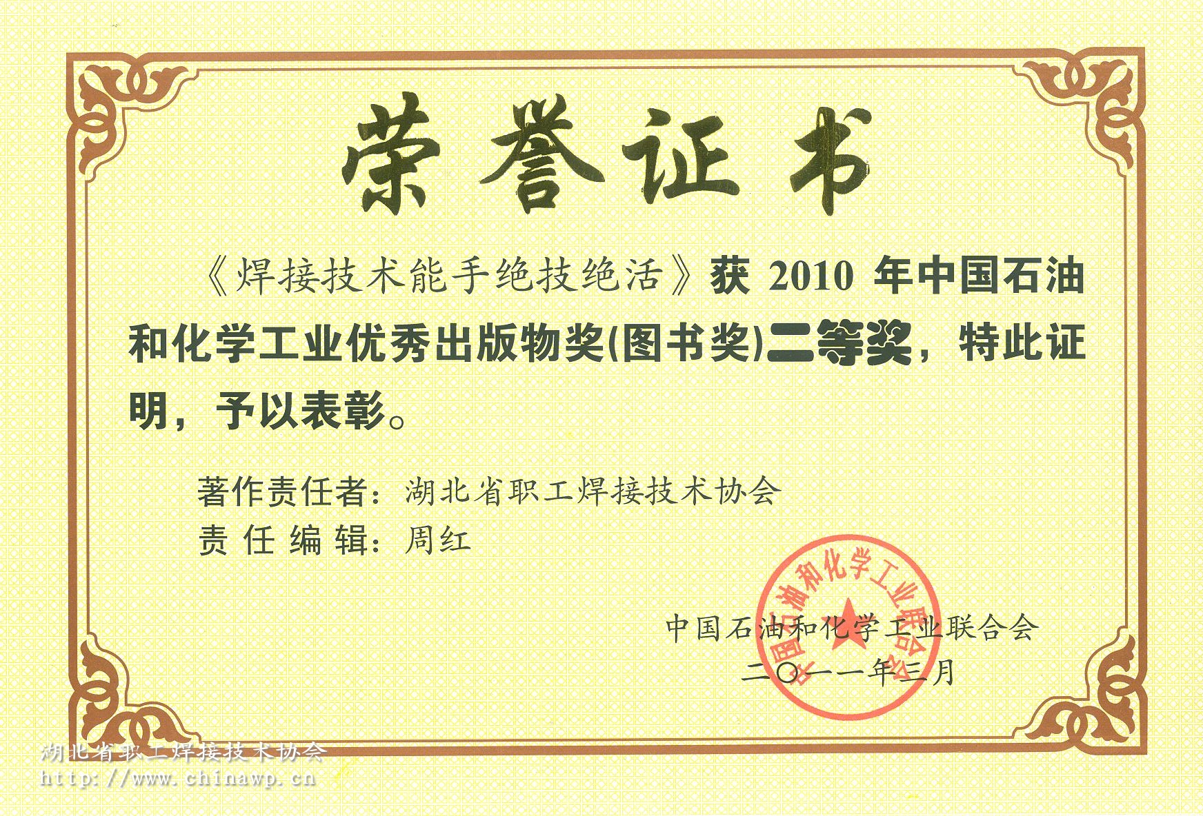 由湖北省职工焊接技术协会组织编写,化学工业出版社出版发行的《焊接技术能手绝技绝活》一书,2010年元月正式与读者见面,受到业内人士和广大焊工的好评。并于2011年3月荣获“2010年中国石油和化学工业优秀出版物(图书奖)二等奖”。