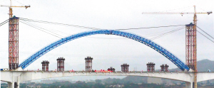 昨日,中建三局钢结构公司制作安装的“亚洲第一跨”——连接广东珠海斗门和江门新会的虎跳门特大桥单线提篮拱成功合龙。该提篮拱拱肋跨度为248米,在亚洲同类桥梁中跨度最长,全桥钢结构重约1156吨,现场安装用时仅1个月。