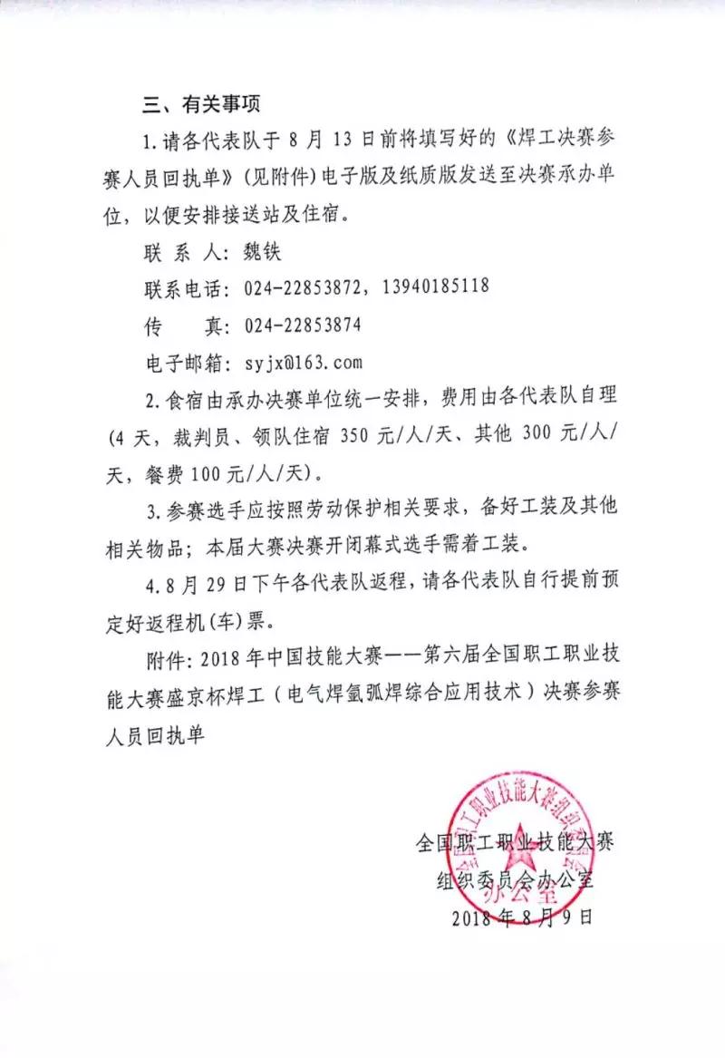 第六届全国职工职业技能大赛盛京杯焊工(电气焊氩弧焊综合应用技术)决赛参赛人员报到通知
