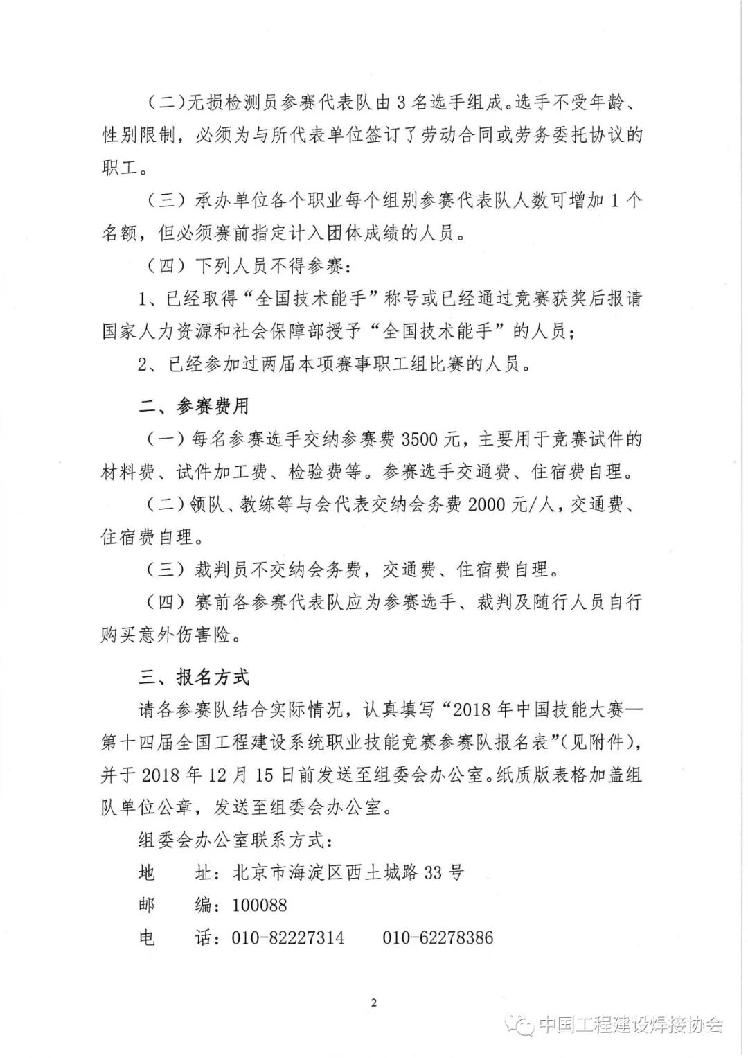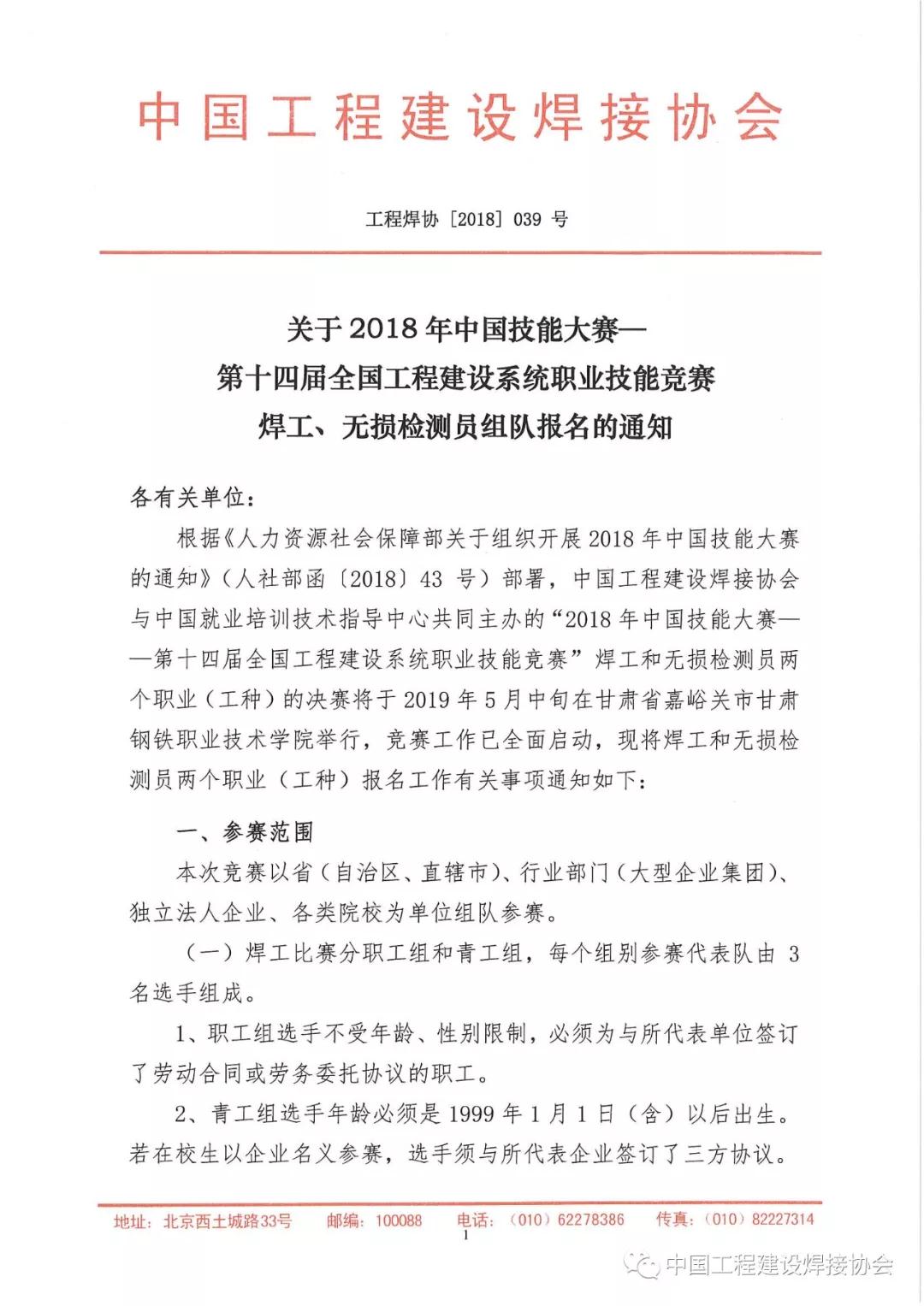2018年中国技能大赛——第十四届全国工程建设系统职业技能竞赛 焊工、无损检测员职业报名工作正式启动! 全国工程建设系统职业技能竞赛是人社部中国就业培训技术指导中心、中国工程建设焊接协会联合举办的国家级二类竞赛,1993年创办至今,已经培养出以周树春为代表的一大批行业领军人物,经过竞赛锤炼的专家、教练团队,在充分总结竞赛成功经验的基础上,培养出我国第一位登上世界技能大赛领奖台的焊接项目银牌选手裴先锋,后又一鼓作气培养出了曾正超、宁显海2位世界技能大赛焊接项目冠军选手,曾正超同时还被赛会授予第43届世界技能大赛国家最佳选手。 2018年中国技能大赛——第十四届全国工程建设系统职业技能竞赛设置了焊工、无损检测员、焊接机器人操作工竞赛三个职业(工种)。焊接机器人操作工竞赛即“熊猫杯”第二届全国焊接机器人操作竞赛,已于2018年9月16日—21日在江苏省南京市成功举办,是国内第一个全国性、跨行业的焊接机器人操作竞赛。竞赛由中国电子熊猫集团南京熊猫电子装备有限公司承办,40个代表队70名选手参加了竞赛,竞赛全部采用了国产设备和焊接材料,并在国内首次将变位机用于竞赛。竞赛以其科学、严谨、公平、公正、公开得到社会各界的盛誉,也为今后焊接机器人操作竞赛提供了可以借鉴的范本。 焊工是全国工程建设系统职业技能竞赛最早设置的竞赛项目,25年的磨砺,焊工项目已经发展成为目前国内考核最为全面、竞赛水平最高、管理最为规范的赛事之一,由此开创的国家级职业技能竞赛裁判员持证上岗制度、仲裁及监督机制,已经在国内被广泛采用,并部分被纳入人社部国家技能竞赛管理制度。第十四届全国工程建设系统职业技能竞赛将在以往竞赛的基础上,借鉴世赛标准,力争为选手提供最佳展示平台。 本届无损检测员职业实际操作竞赛分预赛和决赛两阶段,预赛竞赛项目分为超声波探伤和TOFD检测两个模块,决赛竞赛项目分为超声波探伤和射线底片评定两个模块。组委会将根据参赛队报名情况组织赛前培训。 竞赛报名工作已经全面启动,请及时电话联系中国工程建设焊接协会秘书处,我们将为您提供完善的竞赛服务。 联系人:徐娅 010-82227314 侯敏 010-62278386 |