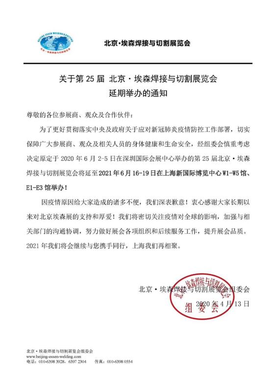 第25届北京·埃森焊接与切割展览会延期至明年
