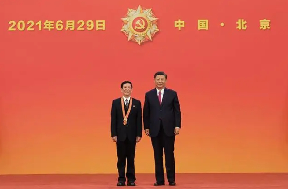 △2021年6月29日,习近平总书记向“七一勋章”获得者艾爱国颁授勋章。