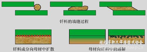 钎焊过程原理如(图1)所示,将熔点低于母材的钎料和被钎焊零件同时均匀加热至钎焊温度,钎料熔化而被钎焊零件保持固态。熔化钎料润湿母材并在毛细作用下填充接头间隙。在随后的保温过程中,液态钎料成分向母材中扩散,使得母材近缝区发生微量溶解并与钎料相互扩散,在降温冷却过程中接头形成冶金结合。