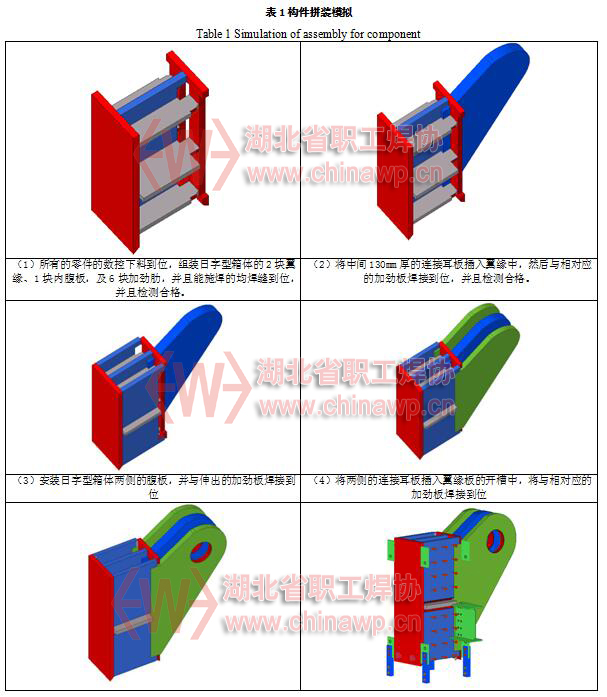 2)出现焊缝无法施焊的现象,例如第(3)步中的中间加劲板,如果不模拟,可能无法判断其在拼装中有一条焊缝无法施焊(电渣焊也无法实施)。只有在模拟过程中发现此问题,才会想办法解决。将两侧腹板断开,加劲板处伸,才将此问题解决。