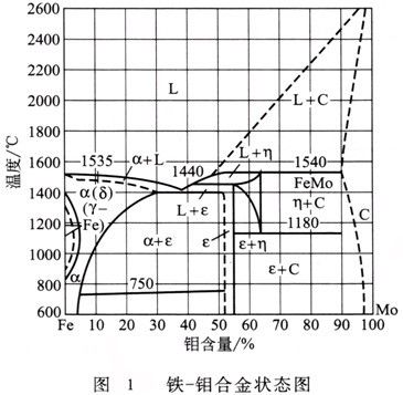 铁-钼合金状态图见图1。从状态图中可知Fe与Mo能形成不同浓度的α-Fe和α-Mo固溶体。此外还可以形成两种金属间化合物脆性相ε-Fe3No2和η-FeMo。Fe3No2直至1450℃的温度范围都是比较稳定的。状态图中的η-相,它的存在温度区间为1180~1540℃,当冷却时,η-相分解为ε-相和α-相的固溶体。
