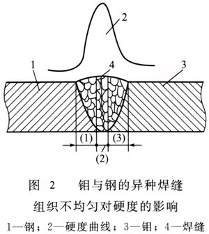 ③ 钼与钢焊接的异种焊缝金属由三部分组成,而且焊缝成分不均匀。靠近钢母材金属侧的是由钢与金属间化合物组成的双相组织,其硬度急剧上升;靠近钼母材金属侧的是由金属间化合物组成的双向组织,硬度也急剧上升;焊缝中间是由钼与钢之间的金属间化合物所组成的,硬度很高。