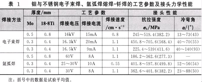 为了提高钼与钢的接头性能,还可以采用加中间过渡层的方法,焊接工艺虽然复杂,但是其焊接性良好。焊前对焊件进行表面处理非常重要,焊接工艺参数须严格控制,表1列出了采用电子束焊和氩弧焊对钼与钢进行熔焊-钎焊的工艺参数及接头力学性能。