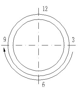 (1)管排水平固定焊缝由于位置的特殊性,管于管之间只有十几毫米间隙,因此管子下半部焊接操作难度较大。为了保证根部焊缝熔合良好,在以往焊接方法上经过改进,打底层我们采用从立焊(时钟三点位置)部位内填丝焊至过仰焊位(仰焊位时钟六点位置)收弧,然后在收弧处接头,从接头处焊至立焊(时钟9点位置)。焊接方向示意图见图3。
