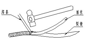 有些裂纹较宽或砂眼、气孔直径较大时,采用锤击捻压法有困难,可先用合适的铁丝或焊条头将裂纹或孔洞铆住,以减少外漏的压力和流量,然后再快速焊。有些裂纹的周边不规则时,可采用破布、薄木片、竹片塞进去再快速焊。此法操作的要点是一次只能先堵塞一段,然后快速焊,堵塞一段焊一段,图1所示。