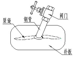 适用于泄漏面积较大或者流量较大或者压力较大时的焊接。如图3所示。根据泄漏处的形状制作一块带截流装置的补板。泄漏较为严重时,截流装置用一段导流的管子,在上面装一个阀门,泄漏较小时,补板上预留一个螺丝帽即可。补板的面积一定要大于泄漏处,截流装置在补板上的位置一定要正对着泄漏处,补板与泄漏处接触的一面涂上一圈密封胶,让泄漏的介质从导流管流出,以减少补板周围的泄漏。补板焊好后,关闭阀门或拧紧螺栓即可。