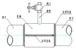 管道因腐蚀或磨损而大面积泄漏时,用一段同径或正好抱住泄漏管径的管子作为套袖管,长短尺寸视泄漏处的面积而定。把套袖管对称切割成两半,焊上一个导流管,具体焊法与导流焊接法相同。在焊接顺序上应先焊接管子与套袖的环缝,最后焊接套袖的焊缝。如图4所示。