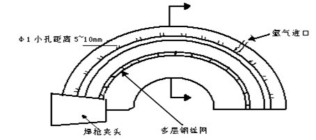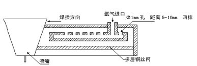 (3)热态焊缝和邻近母材的保护装置。在熔池之后的热态焊缝和邻近的母材需要用辅助的气体保护装置进行保护。保护装置设计不仅要能够达到良好的保护,而且要方便操作,这是锆焊接的技术诀窍之一,如图8。
